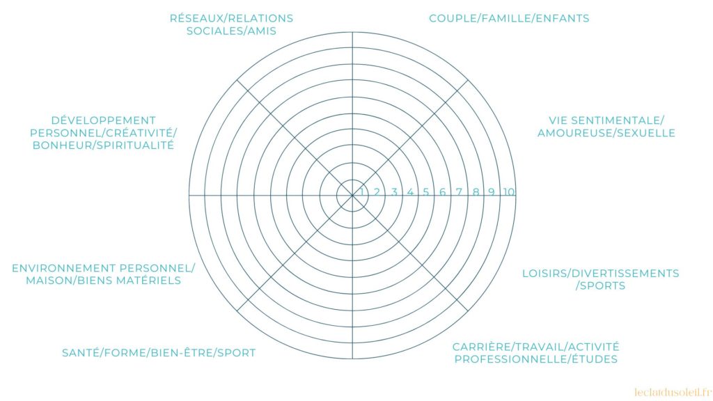 La roue de la vie est un outil de développement personnel qui permet de visualiser l’équilibre de sa vie et notre niveau de satisfaction dans différents domaines.