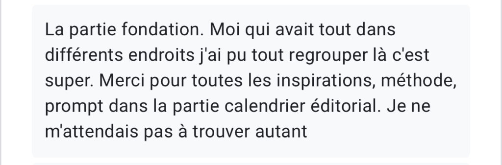- LES FONDATIONS : L’endroit où tu poses les bases solides de ton business : ta vision, ta stratégie, tes offres, ton identité de marque, etc.